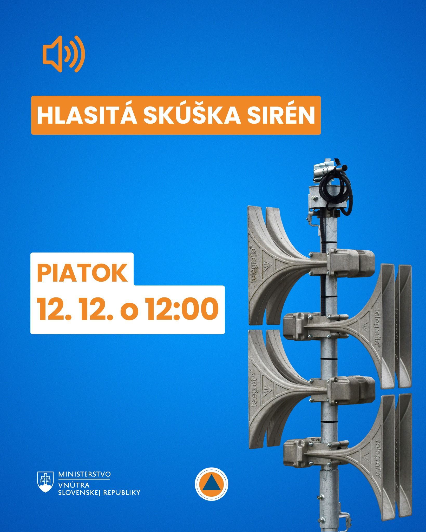 V piatok 12. decembra o 12.00 h bude vykonané preskúšanie varovnej siete sirén na území Slovenskej republiky hlasitou skúškou.